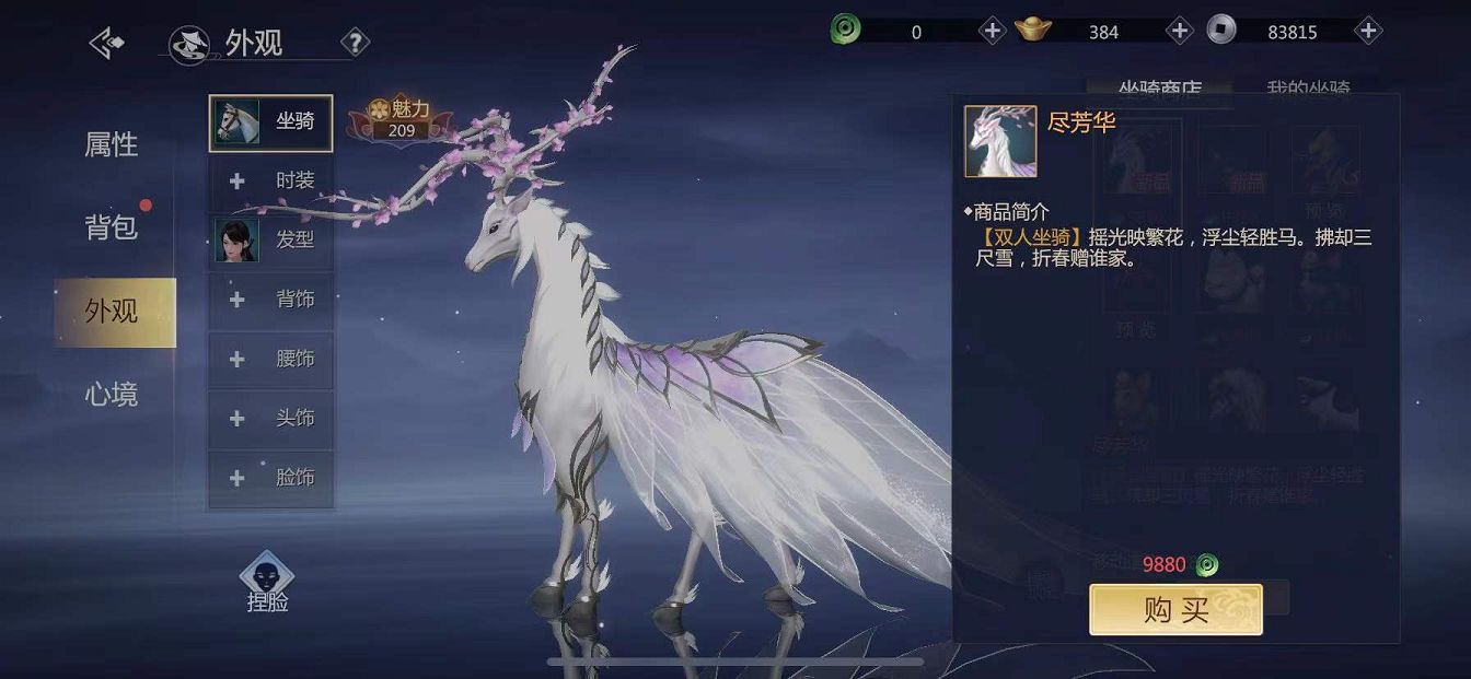 第二种获取坐骑的方法是通过购买获取,玩家可在游戏主页面的菜单栏里找到商城,商城内会有很多坐骑存在,玩家只需要消耗一定数量的翠玉就能进行购买了,翠玉可以通过做任务获取。也可通过充值获取,一般通过购买获取的坐骑都是比较稀有的,价格也会根据稀有程度来决定。