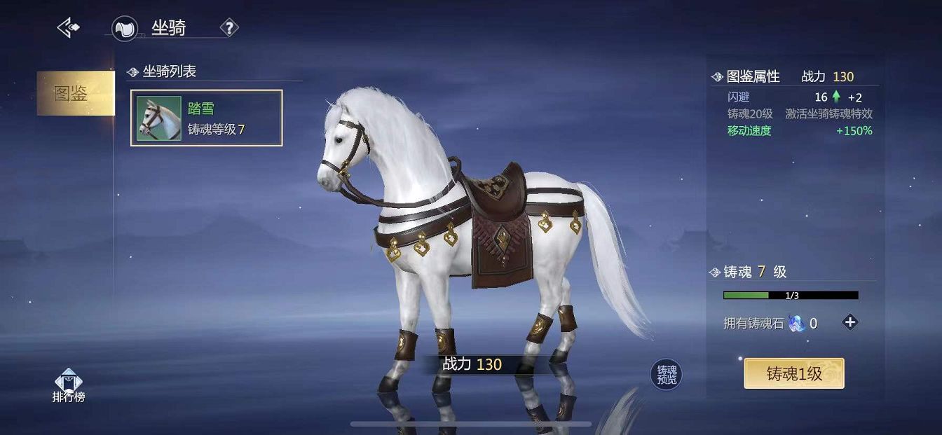 坐骑可以说是游戏内除了主角之外另外一个很强大的存在,在获取之后他除了基础属性之外,玩家后续还能对其进行一个升级升阶,品阶越高,坐骑的战力就会越高,它的各方面属性也都会得到一个提升,坐骑升级需要用到铸魂石,铸魂石可通过奇珍阁购买,也可通过做任务获取。