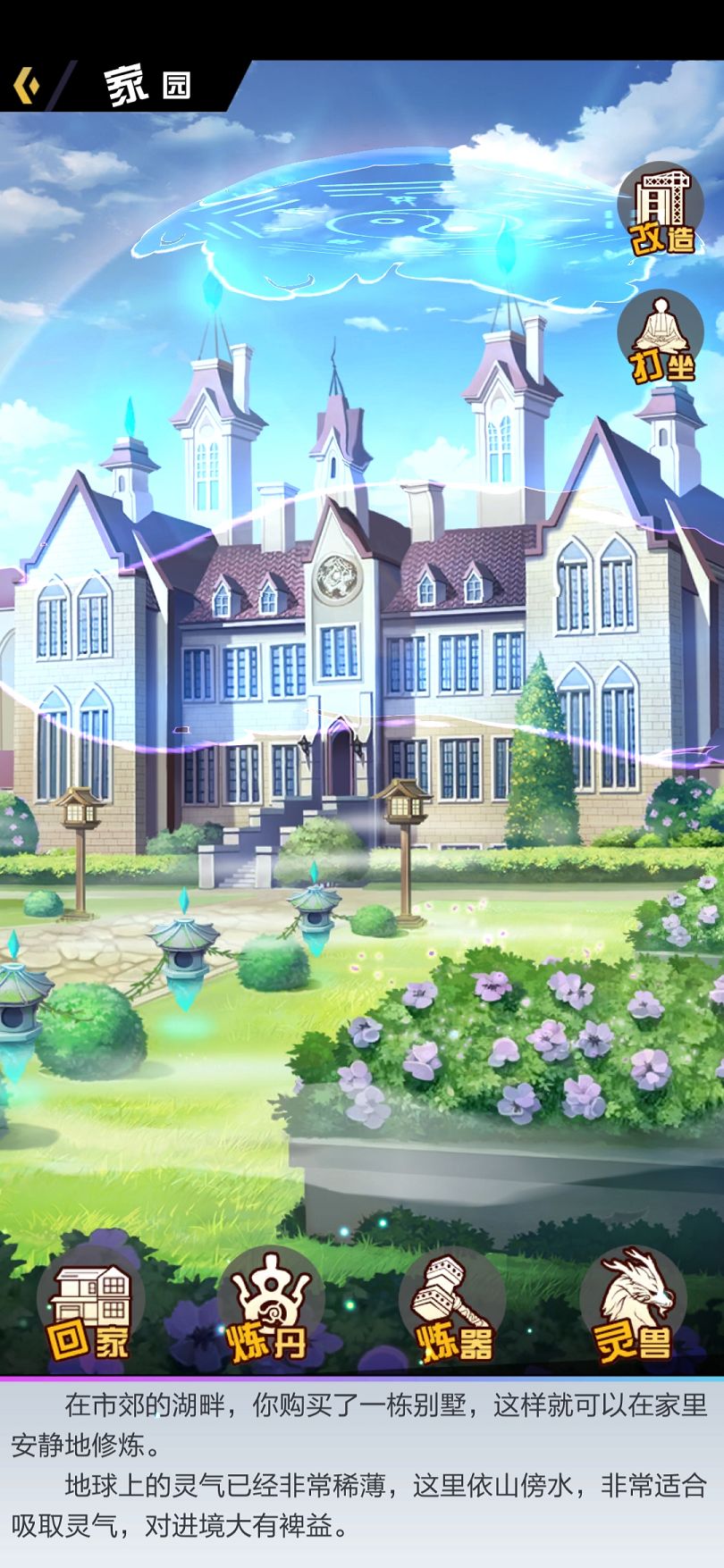 首先玩家进入游戏后会有一个家园的图标,点击家园的图标,在家园的右上角有一个打坐的选项,这里也就是提供玩家修行的地方。