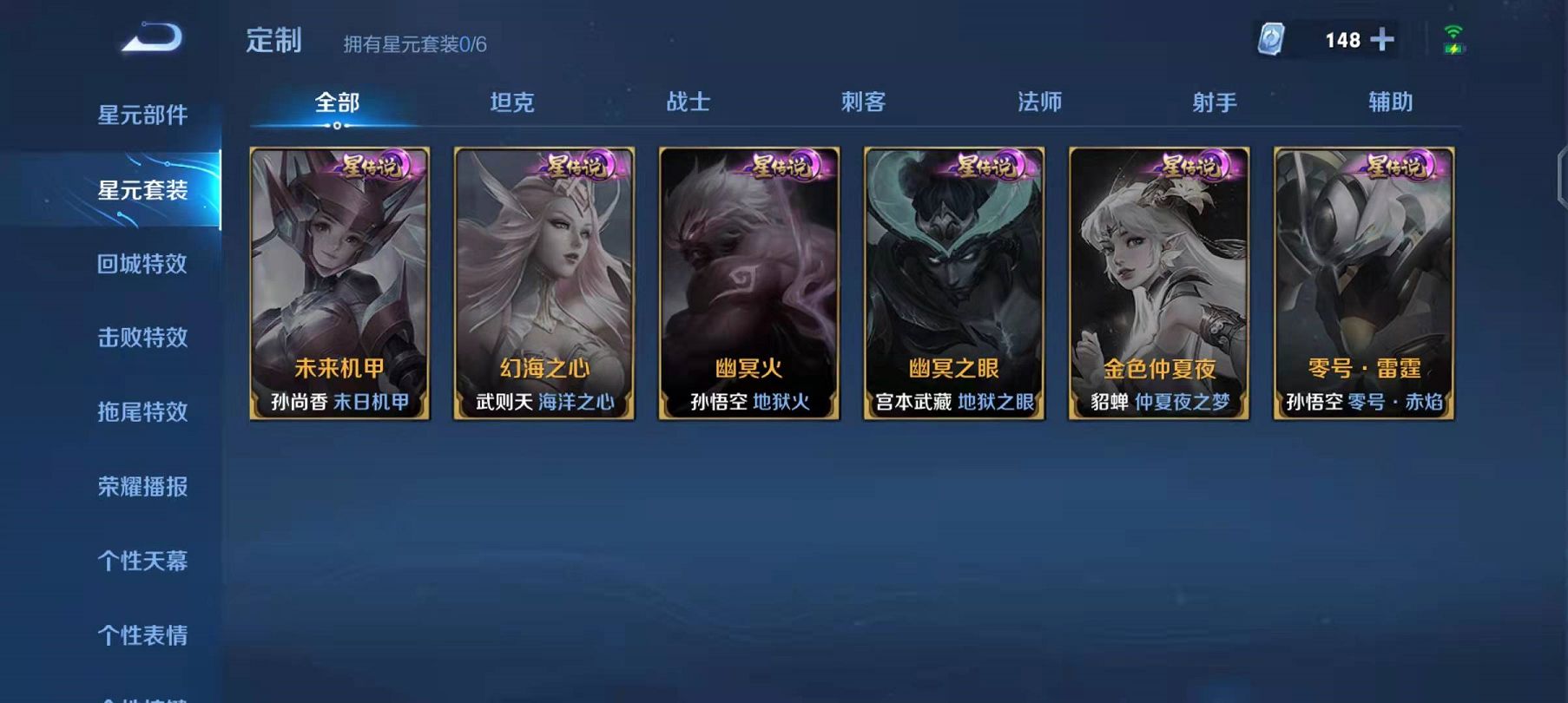 2、星元套装:目前只有五款皮肤有星元套装,分别是孙尚香的未来机甲、武则天的幻海之心、孙悟空的幽冥火、宫本武藏的幽冥之眼、貂蝉的金色仲夏夜、孙悟空的零号雷霆。