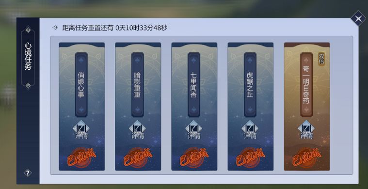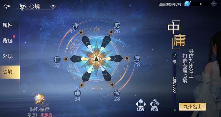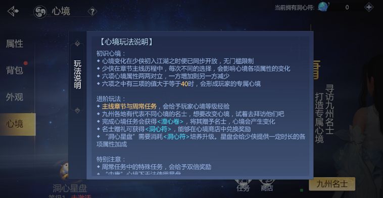 初始的心境均为洞心星盘,在未激活的状态下心境并不会为角色进行属性提供,玩家们需要点击任务来观察到每日可以进行的心境任务,完成了这些任务之后,才可以获取大量心境经验,并最终将心境激活。