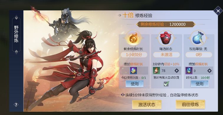 当然,如果玩家们在野外修炼当中的十倍经验值非常充足的话,小编也建议大家选择该方式来进行挂机战斗,获取到的经验值可以快速帮助角色升级,每一次升级角色都将迎来高额的战斗力增加。