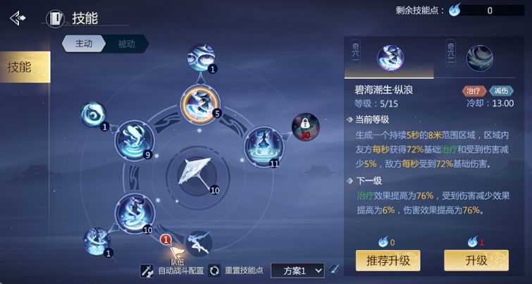 在防御能力方面,碧海潮生技能则是易水的主要生存核心了。该技能在释放之后,会对区域内的所有友方进行多次生命恢复,而敌人反而会持续的丢失生命值。如果玩家们想将易水培养成团队核心的话,就要优先升级该技能。