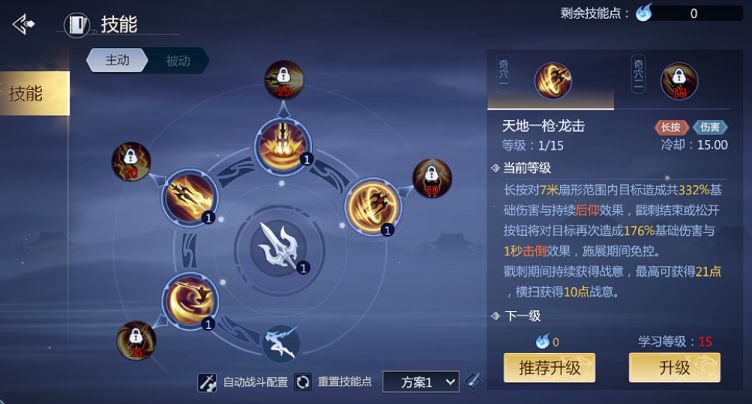 当天王来到中期阶段的时候,技能加点的中心则需要转换为天地一枪,该技能的培养可以直线提升天王的输出能力。搭配上追星逐月一同使用的情况下,可以在短时间内对敌人造成致命一击。