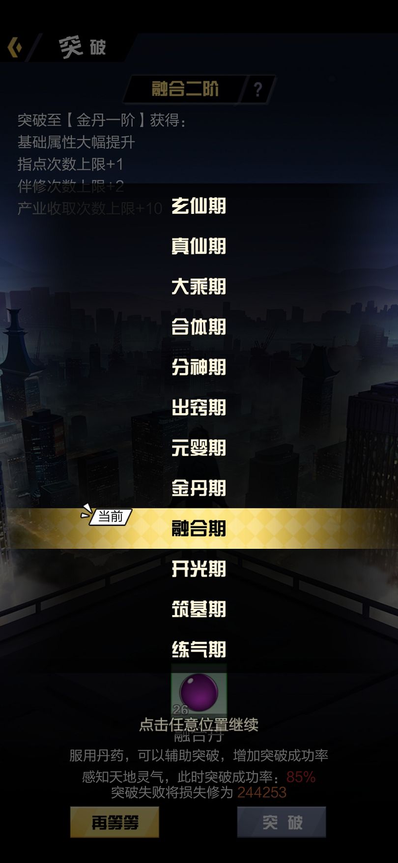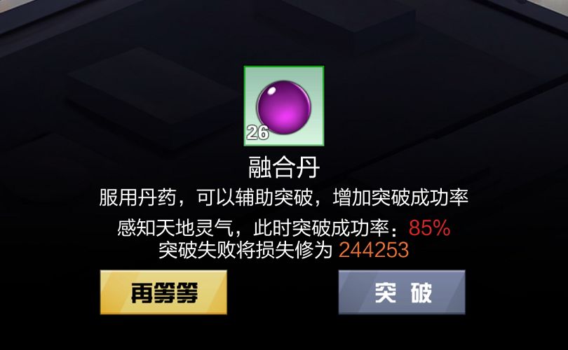 达到相应的修为要求后,还需要注意的就是丹药的使用,丹药能够在都市剧情的探索中获得,在突破时使用相应的丹药能够让突破的概率达到百分之百,否则的话可能会失败,不仅无法突破筑基六阶还会失去部分修为,这也就回导致游戏进度变慢,没有足够的战力去通过后续的关卡。