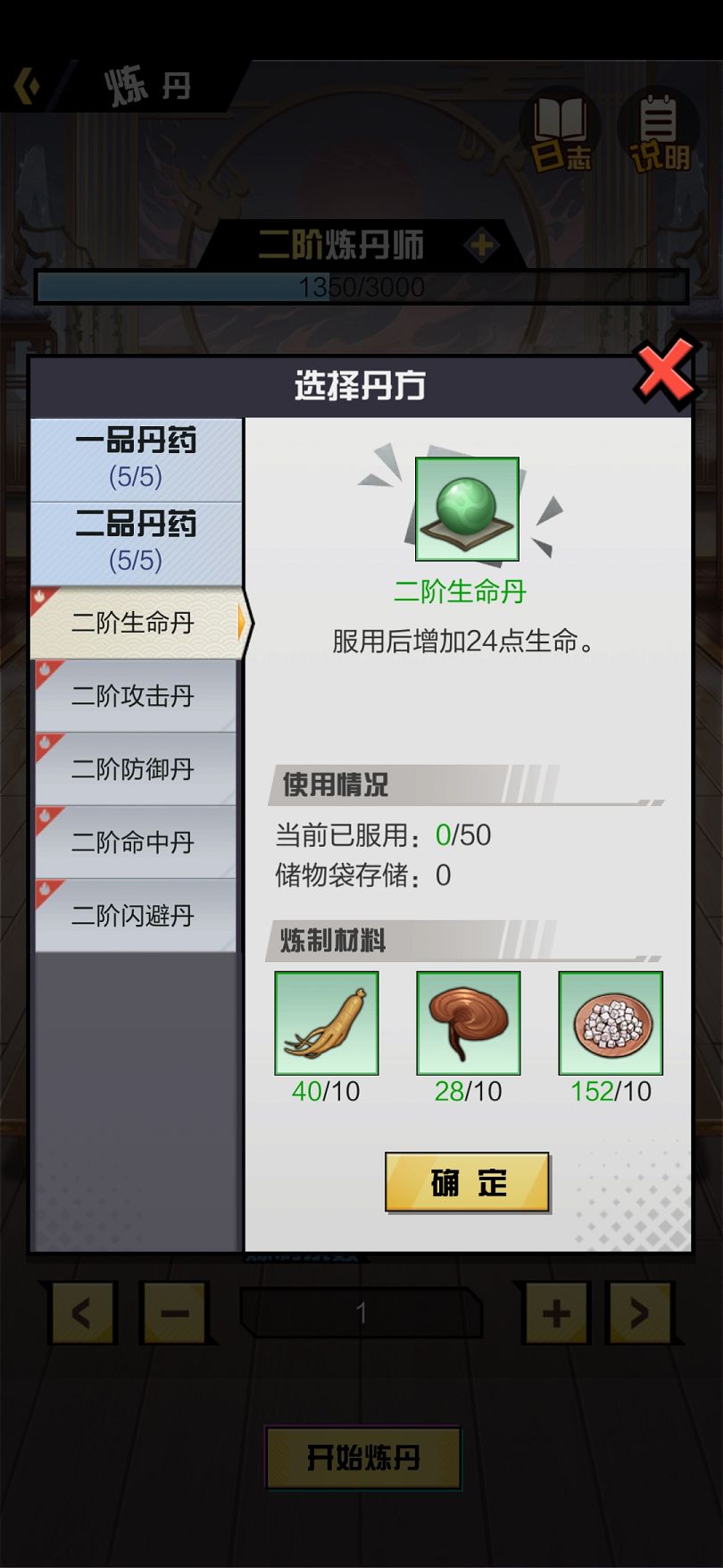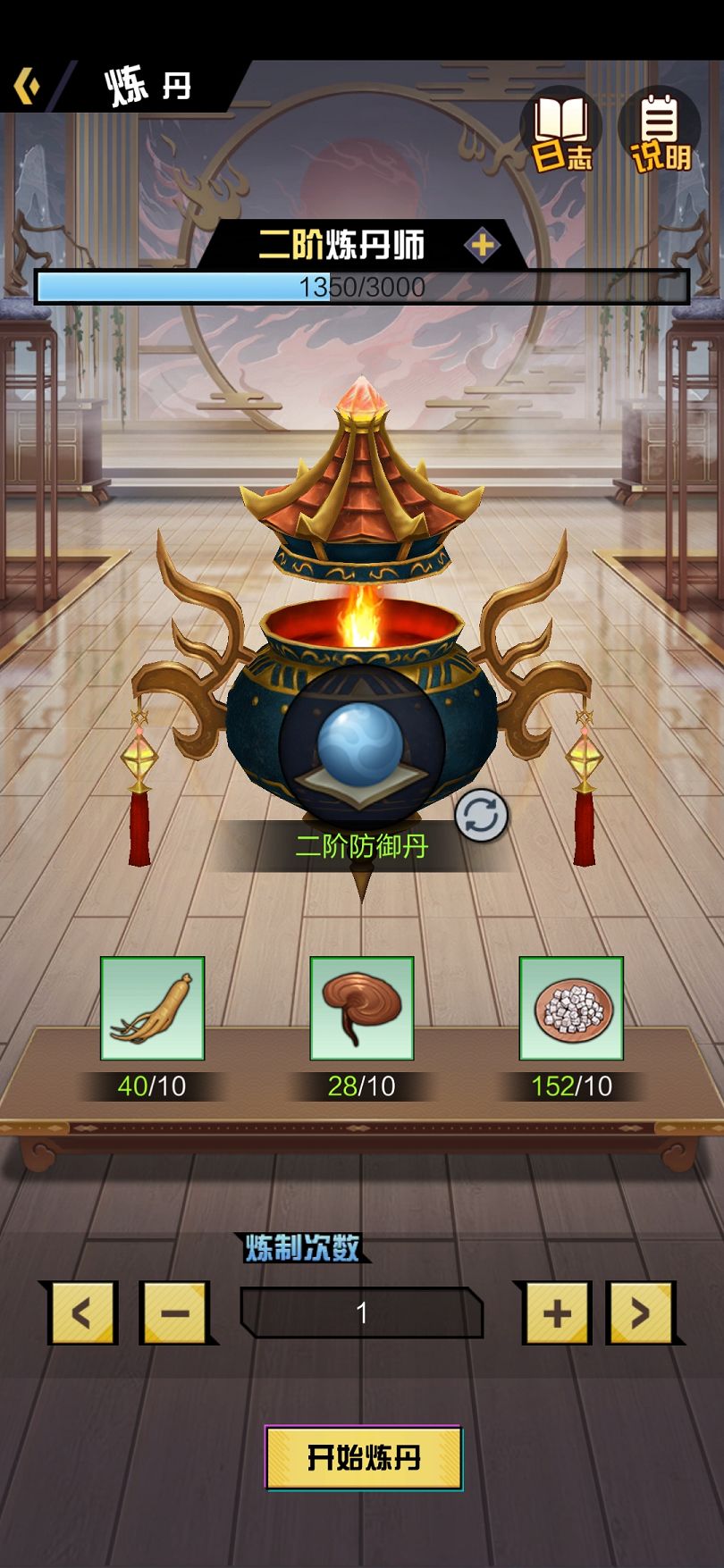 首先来看防御丹,顾名思义能够增加玩家防御值,需要人参、灵芝、茯苓各十颗方可炼制,一阶防御丹可获得4点防御力,随着品阶的提升所能获得的防御力数值翻倍。