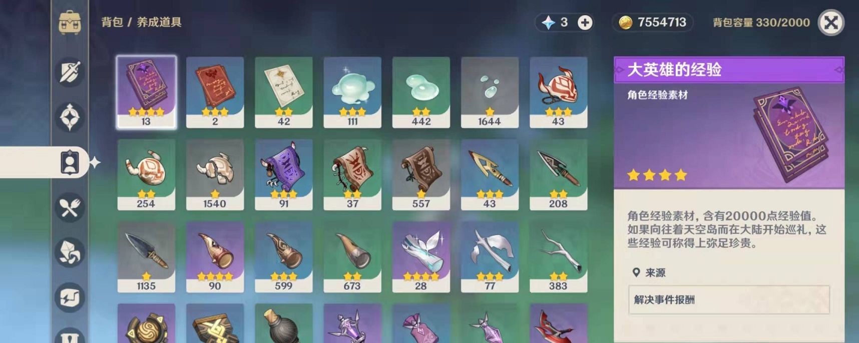 1.大经验书在游戏中获取的方法很有限,通过版本活动挑战可以获得一些,一般每周都会更新一个新活动,一般能够拿到40本左右的经验书,数量是比较少的。近期立本回归旅行者可以拿着甜甜花去找他换一些资源。