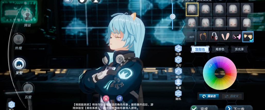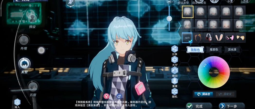 发型直接选择第一个即可,不需要任何的发饰,发顶颜色选择偏向于青浅蓝,发尾颜色和发顶光泽保持一致即可。发顶光泽颜色调到58,饱和度调到60,明暗度调到80,渐变百分百,发尾颜色54,饱和度67,明暗度69,渐变百分百。