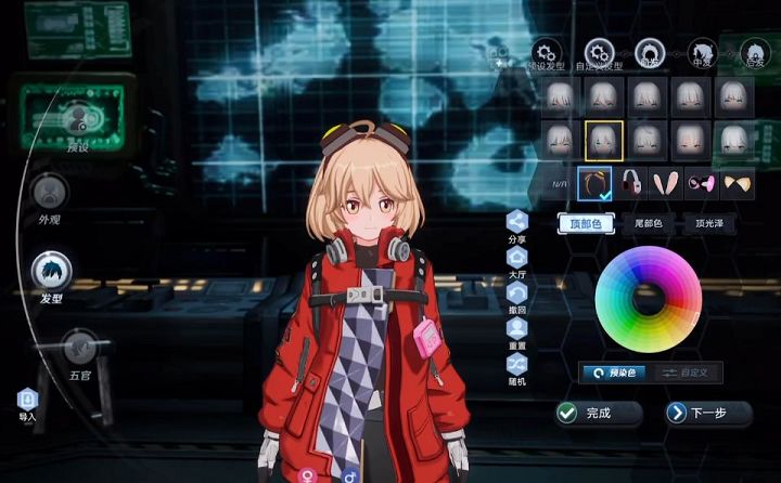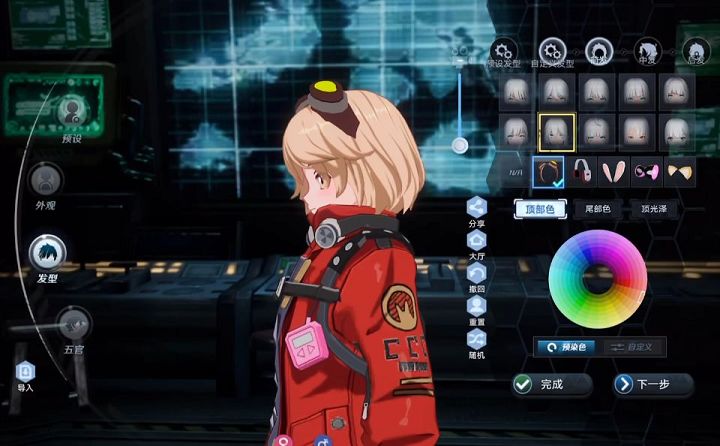 发型我们选择第四个,不需要任何的发饰,颜色也是偏向于黄色一点,颜色数值调到100,饱和度调到50,明暗度调到90,渐变度调到40%,发尾部色颜色调到66,饱和度调到46,明暗度调到77,渐变调到40%,发顶光泽颜色调到20,饱和度调到63,明暗度调到33,渐变调到40%,侧发也要稍微的调一调。