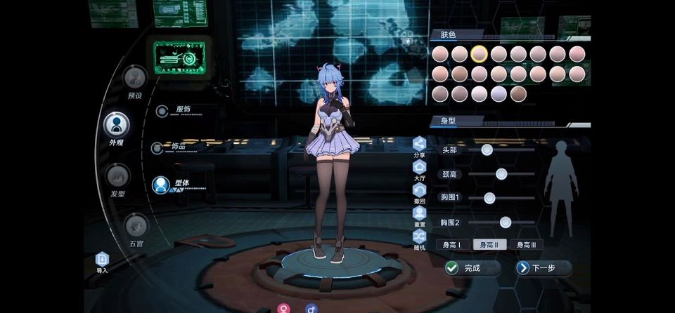 基础套装不选,肤色选择第三项,身形头部调成25%左右,颈高50%,胸围25%,胸围2调成60%。