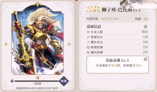 SSR处女座的效果是能够降低5%角色受到的伤害,其实就是一个固定的减伤效果,用在勇士队也是可以的,提高角色的续航能力,在某些时刻可以发挥非常至关重要的作用。SSR天蝎座效果是在敌人生命值低于30%的时候提高10%的伤害,用来清场也是非常合适的,但是对于后台的的敌人似乎无效,在boss战中能够发挥一定的作用。