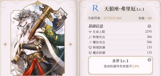 首先就是系统默认赠送的两张R级本命卡。R幼师座的效果是在除对战模式下角色提升500点的初始奥义值。这个命魂提升奥义值,也就是可以提前释放奥义,对于夜崎隐这种勇士英雄是有着提升效果的,但是总体对于勇士队来说提升不是特别大,但是在前期缺其他命魂的情况下用来过渡是非常合适的。另外一张R天狼座是可以提升3%的最终伤害,这对于勇士队来说就是非常合适的,推荐给勇士队使用。