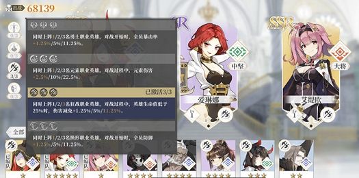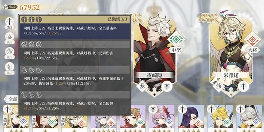 首先我们来看一下勇士队,目前主流的勇士队就是米兰达、夜崎隐以及米雅诺分别单人队伍中的先锋、中坚以及大将。勇士职业以物理伤害以及暴击伤害为主,在战斗中可以凭借技能对物理伤害、暴击率以及暴击伤害进行高幅度加成,从而打出可观的输出数值。目前勇士队也是非常主流的阵容搭配。而三个勇士职业角色上阵可以为队伍带来11.25%的暴击率提升。