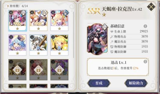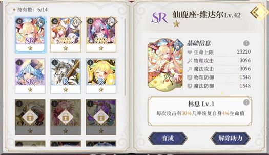 3.专属适配型:对于某些比较契合的角色来说加成很大,如果装配给了其他角色则完全没有效果,比如SSR级的白羊座·莎媞、SSR级的天秤座·迪拉罕以及SR级仙女座芙蕾雅。前期在角色练度没有上来的情况下不是太建议花精力去获取、培养这些本命卡,等到中后期阵容固定了或者是契合的角色强度上来了再来培养也不迟。像迪拉罕就特别适合用于输出类并且带有冷却重置技能的职业,这样可以通过频繁的攻击来触发降低敌人命中值的效果。