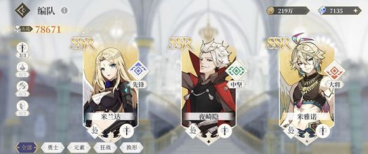 首先就是以出阵三个勇士职业角色为主的勇士流派了,这个流派主要出阵的英雄就是米兰达夜崎隐+第三个任意角色。米兰达为先锋角色,先手打出一轮技能之后等到敌人出手之后就要立刻切换到夜崎隐。勇士流主要的特点就是暴力输出,不管是主线剧情还是对战都都能够取得亮眼的表现。三个SSR角色想要角色的资源需求比较高,对于零氪或者是低氪玩家来说比较吃力,是目前的主流玩法。