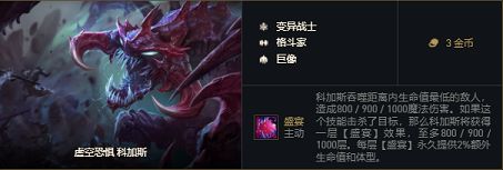 变异战士是云顶之弈手游S6特色非常鲜明的羁绊,变异战士的羁绊包含暗星、森林、剑士等多种效果,但是每局每局会随机给玩家一种羁绊效果。在森林、暗星等羁绊相继被削弱之后,剑士的羁绊效果反而被加强了,所以这也是近期被玩家开发了出来新阵容。剑士羁绊效果即超级肾上腺术,斌一站式的攻击有一定几率对目标攻击两次。所以这个羁绊给到变异战士大嘴、卡莎等英雄的输出都能直接翻倍,但是这套阵容的主C却是大虫子。