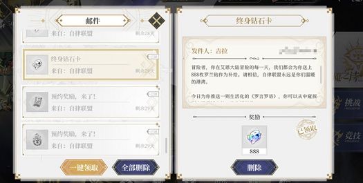 想要获取终身钻石卡我们就必须要在公测开启的一周内登陆游戏,第一次登陆就会自动获取。获取终身钻石卡之后,每天上线游戏都可以固定获取官方赠送的888罗兰钻了,领取入口就是在邮箱内,可以说非常良心了。罗兰钻是终焉誓约游戏中非常重要的一种货币道具,在游戏的商城中我们可以使用罗兰钻购买干劲(体力)、英雄征募券、流彩启源石、装备觉醒石、命运觉醒石等道具素材。