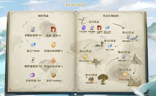 游戏公测时发放的奖励有两个方面,第一个就是预约奖励,主要给奖励给在公测之前预约了游戏的玩家。其中包括了13个英雄征募券、一个SSR英雄爱琪、5k罗兰钻、1个SSR任选英雄、10个羁绊速递券、1个SSR任选本命、50个本命异晶以及5W金币。另外一个部分就是登陆首周福利,其中第一天登陆就可以获得1个任选SR英雄、10个英雄征募券、一个SSR英雄爱琪以及今天我们要讨论的终身钻石卡了。