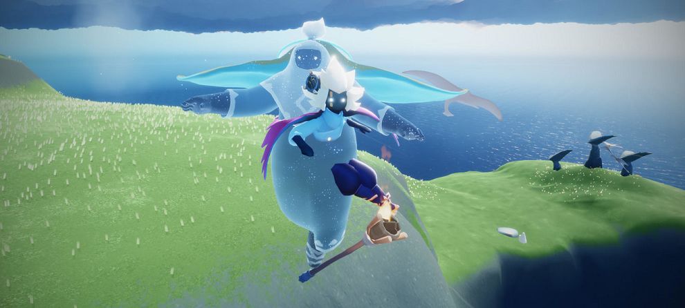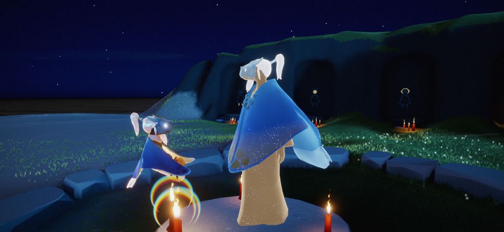 这次先祖为我们带来的是有海龟特色的蓝色斗篷和海龟面具,还有一个白色高马尾,都非常有特点,其中斗篷是最贵的,需要75个蜡烛。还有深呼吸动作,要换完四个等级一共要13颗红心,这个动作一二级就是站着的深呼吸,三四级增加了扎马步深呼吸,非常的有意思。