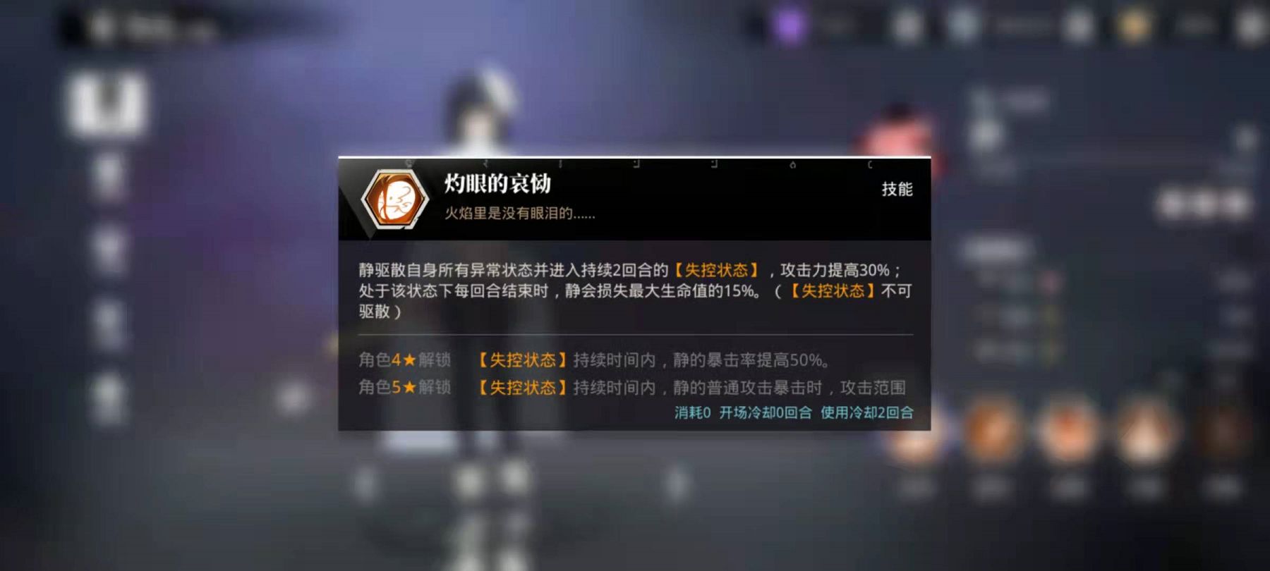 这个技能也有一些不良的效果,那就是说在两个回合的状态消失之后,静会损失自身最大血量百分之十五的生命值,所以静也算是一个比较脆弱的角色。但是这并不影响静的输出,相反,消耗一些血量反倒有利于静的输出,因为静的天赋以血养战,可以直接提高静的暴击伤害,并且当前损失的血量越多,附加的暴击伤害也就越高,当静达到半血之后,可以总计提升百分之四十五的暴击伤害加成。静是一个比较依赖暴击的角色,后期暴击堆起来之后就能做到次次暴击,输出非常彪悍。