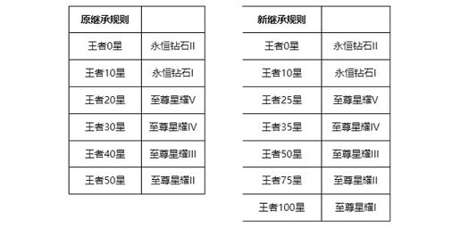在登上最强王者之后,0-24星依旧保持最强王者称号不变,而从25星开始一直到49星则会新增一个传奇王者。在50星-99星之间则沿用之前的荣耀王者称号。如果大家的王者星级达到100星,那么就会获得百星王者的称号。那么在采用新的王者称号之后,王者段位的继承也是发生了一些变化。
