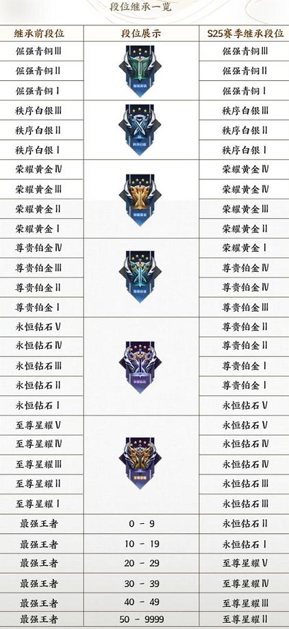 王者0星玩家会继承钻石II,10星继承钻石I。王者25星玩家继承星耀V、35星玩家继承星耀IV,50星玩家继承星耀III、75星玩家继承星耀II、100星玩家继承星耀I。另外还会采用新的专属段位称号供大家获取,除了荣耀王者之外,还会有机关魔导、全职大师、杀戮战神、传说之巅、常胜将军以及绝世无双等称号可以使用。当然了,在S26赛季之后可能会做出调整,但是基本上就是这样的内容,大家可以期待一下。