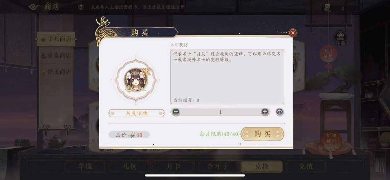 第1种方法是通过商店购买获取,玩家可在游戏主页面找到商店。商店内有一个兑换板块,里面会有很多的名士信物,其中就包括月灵碎片,一个月灵碎片需要60个手札,每个月可以换购40个。