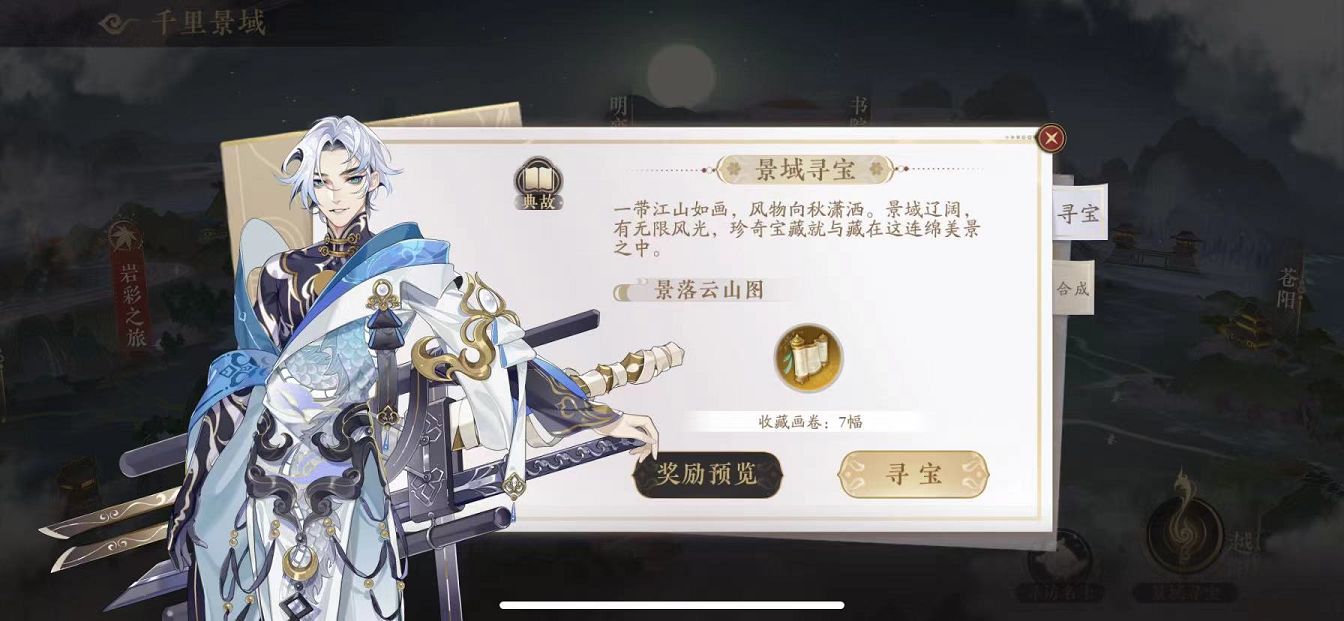 第2种方法就是通过雾苑奇遇获取,小伙伴们可以参与景域寻宝,期间就会有一定的概率可以触发该奇遇,景域寻宝需要消耗一定的图卷,图卷可以通过社团玩法获取,也可通过购买以及合成的方式获取。