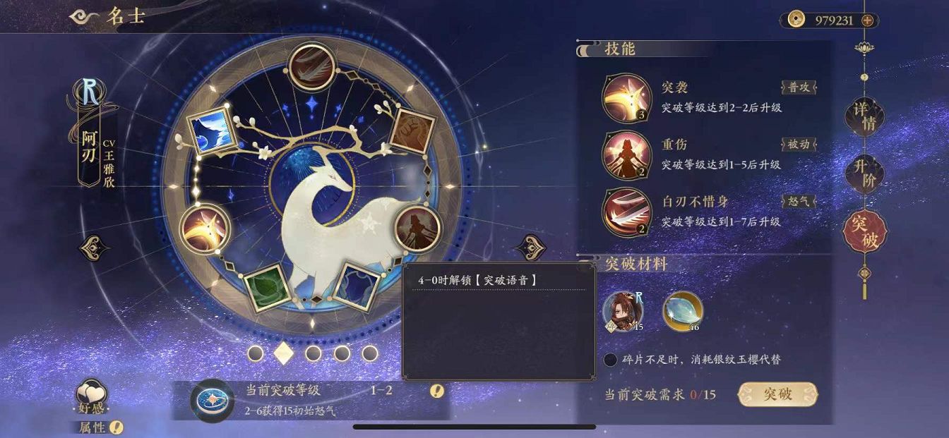 名士的战力代表的就是玩家的实力,这个升级也是可以最大限度提升名士的属性,除了常规的升级之外,还有另外一种突破的方法可以提升名士战力,玩家可以选定一个需要突破的名士,点进人物详情界面,选择突破板块,在这其中就可以对名士进行突破了,突破一共有五个大阶段,每个大阶段又有六个小阶段,每次突破都需要消耗15个名士碎片,不定数量的银纹玉瑛。