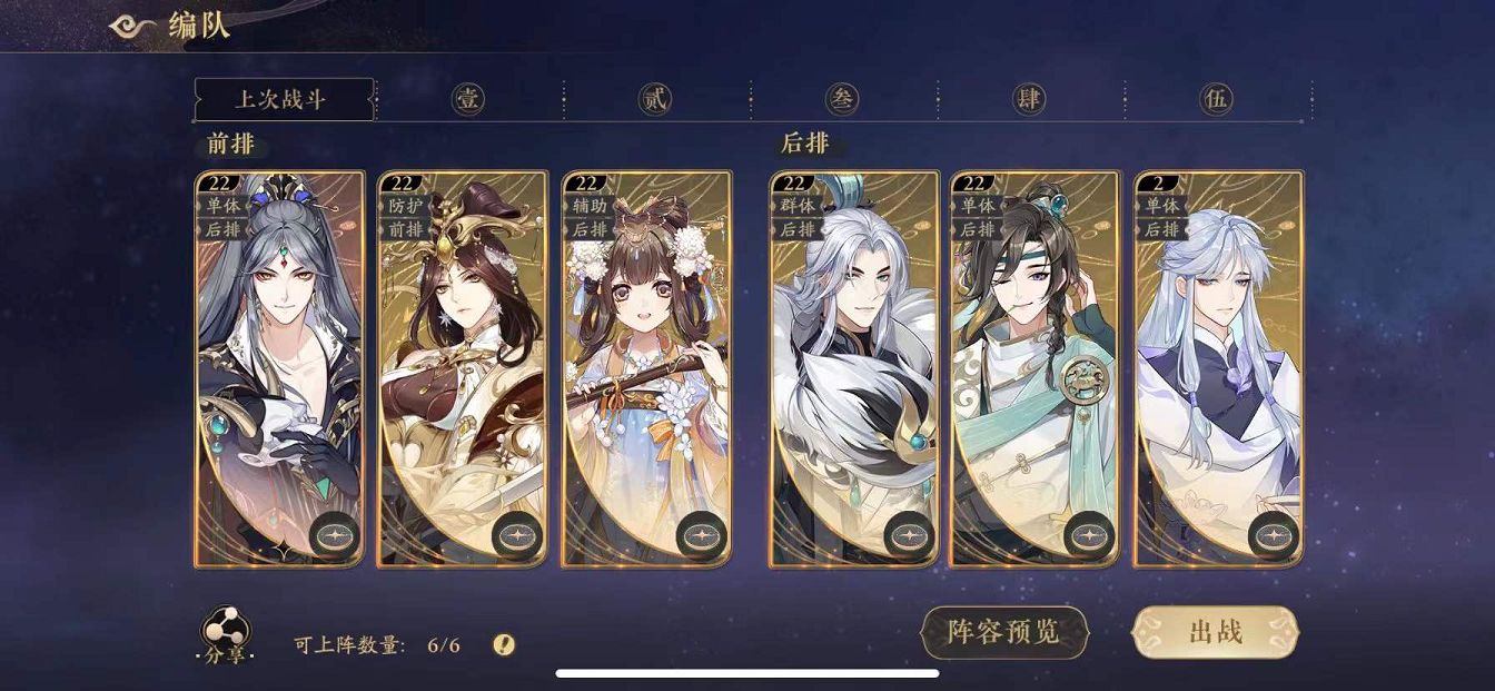 阵容二:两个前排坦克+一个前排辅助+一个后排单体输出+一个后排群体输出+一个后排辅助