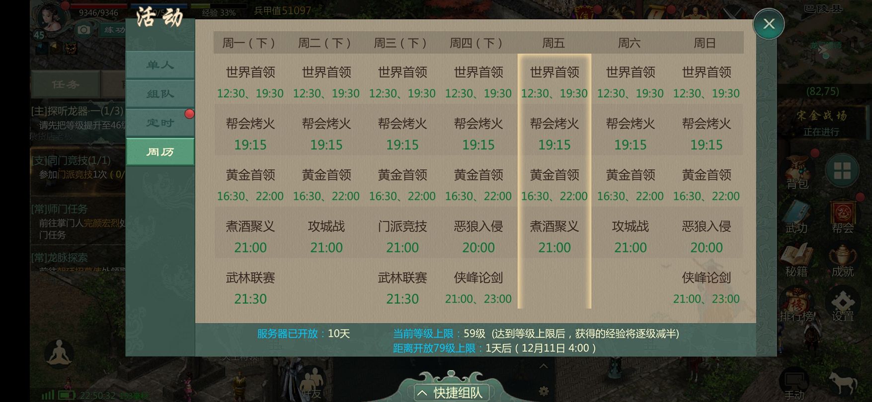 定时任务,固定时间开启的任务,有每天固定开启,也有特定时间开启的,分为单人和组队两大类。是获得道具材料、高级装备的主要途径之一,建议玩家尽量参加,而且很多活动的开启时间还是满友好的。