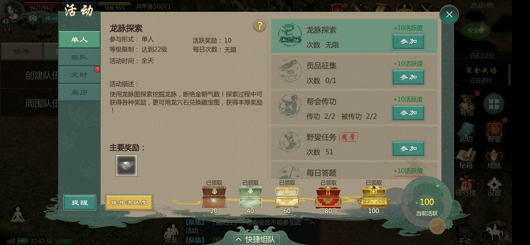 单人任务,常见的有每日答题、师门任务、龙脉探索、贡品收集、龙门镖局、野叟任务和帮派传功等,基本没啥难度,所需时间不长,经验也比较不错。