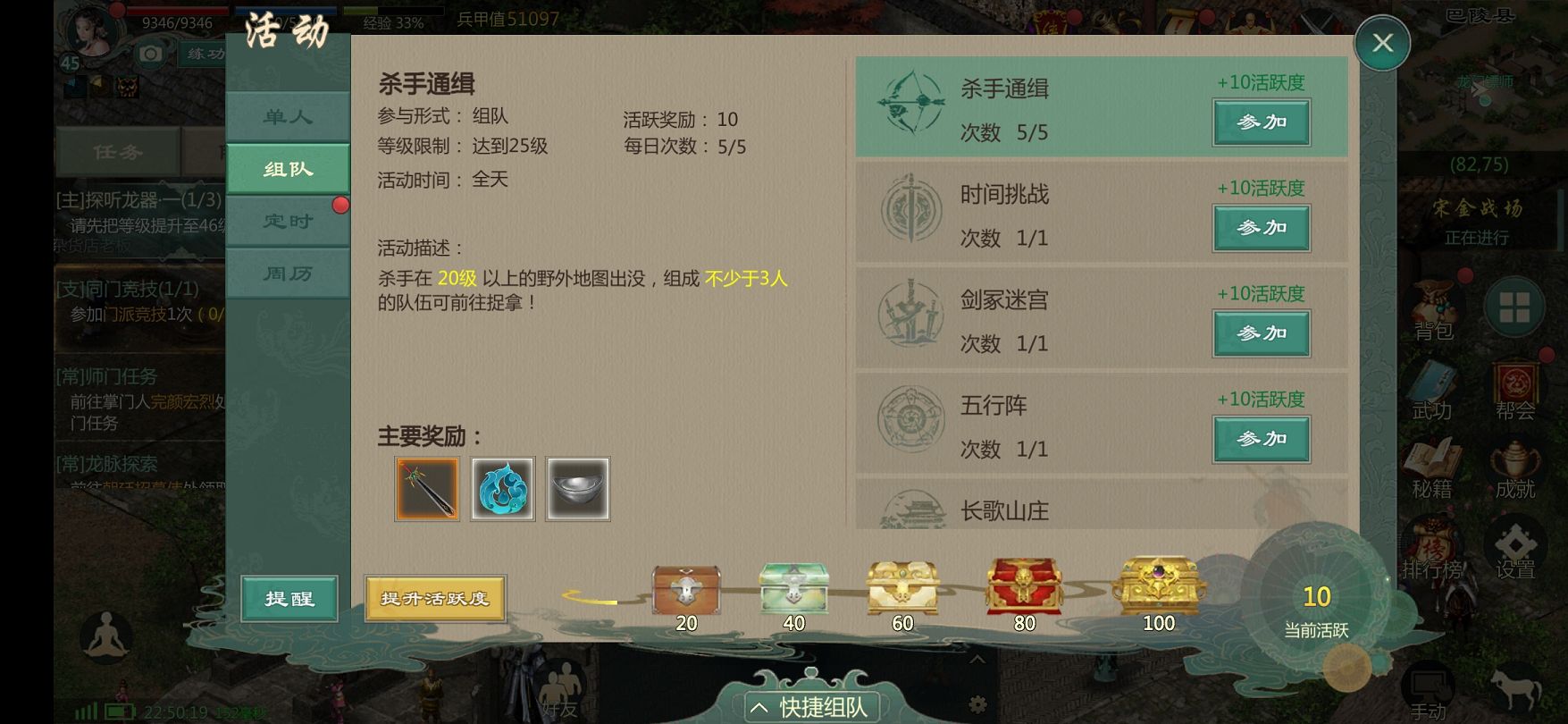 就是每天都可以做的任务,完成后可以获得活跃度奖励,达成一定活跃度可以开启活跃宝箱,达到100活跃后会有50金币。其中又分为单人、组队和定时任务三大部分。