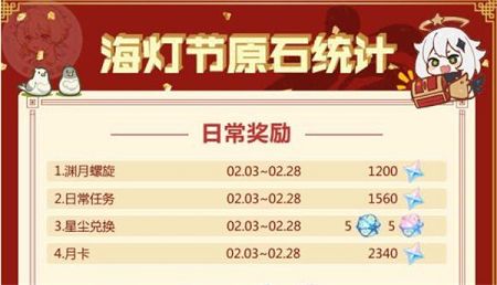 去年海灯节开始之后,完成海灯节轶事的居民请求就可以获得780的原石奖励,还有一些角色的试玩和新角色传说任务都可以获得不少的原石奖励。
