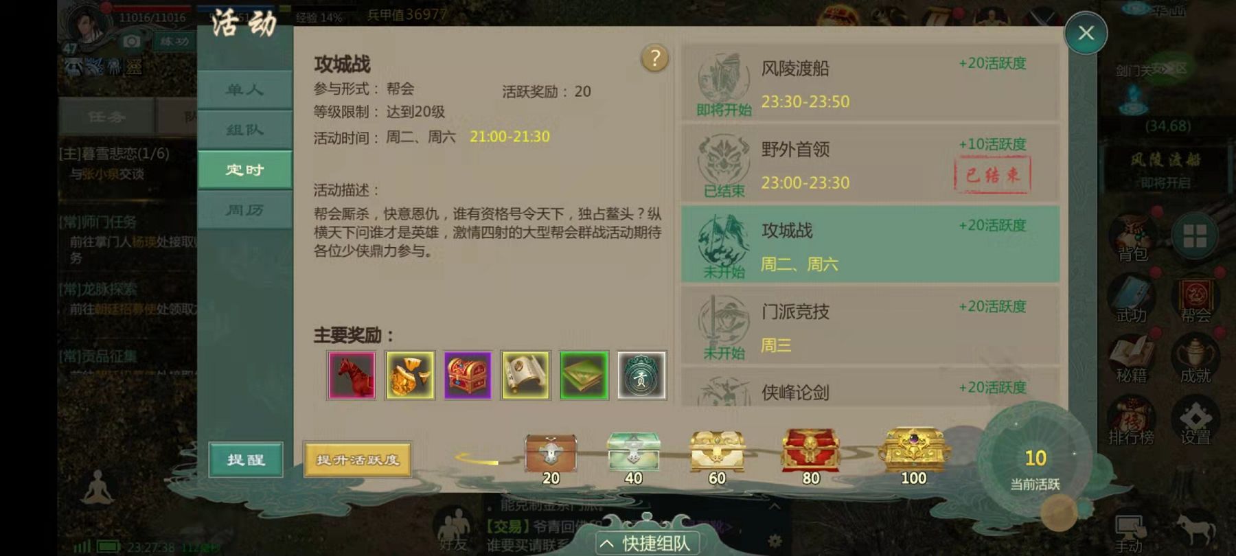 攻城战是限时活动,需要加入帮会之后,以帮会的形式参加,在每周的周二,周六才会开启,开始时间是21.00到21.30.在战斗开启之后,参加保命的帮会可以进入战斗,每一个帮会都仅仅可以占据一个领地。在开战前需要先找好本帮宣战的地方,然后战斗开始直接去打就可以了。
