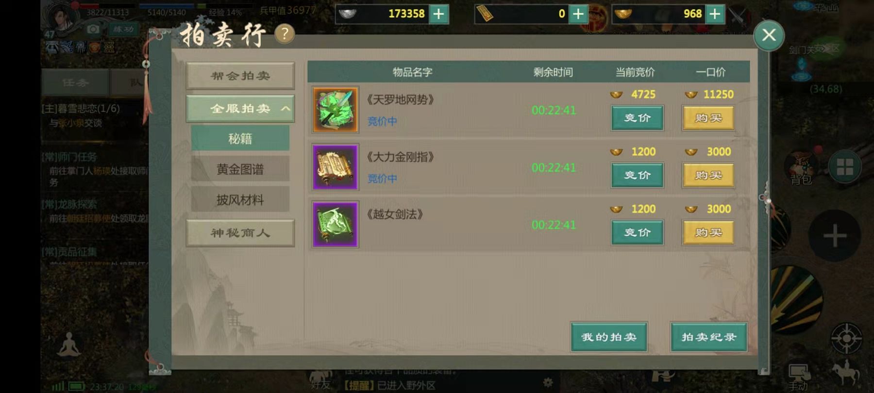 除了任务获得之外,还可以在摆卖行中获得,拍卖行中分为帮派拍卖和全服拍卖,这些拍卖的物品都是在大型的活动中掉落的,在拍卖中所有参加活动的都可以竞拍,竞拍使用的就是金币。然后拍卖得到的金币由所有有资格的人进行平分。这也是日常最重要的金币来源,帮会的竞拍就是帮会所有人平分,世界竞拍就是全服的玩家平分。所以还是加入帮派之后,多多参加活动最重要了。帮派可以参加的竞拍的活动有世界首领,黄金首领,攻城战,饿狼入侵,炎帝宝藏,煮酒起义等。帮派竞拍没有有出价的商品,才会流到世界上进行竞拍。