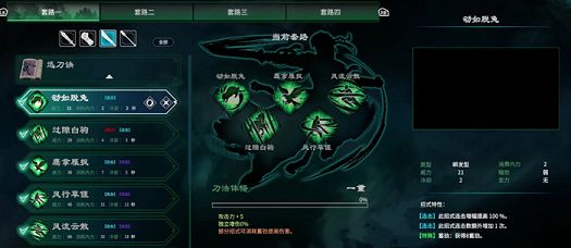 3.讯刀诀:拥有动如脱兔、过隙白驹、鹰拿雁捉、风行草堰以及风流云散这五个招式,对应的八卦为坎卦,拥有5点的攻击力提升以及部分招式可以通过消耗蓄劲提升伤害的效果。这一套其实都算核心,只需要无脑释放cd好的招式就可以了。