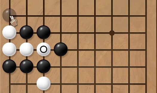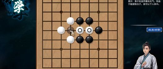第二道也是非常简单,白字在垂直中央的最下方,北面和西边被黑子包住了,我们将黑子下在白字的东面就可以成功破解。第三道类似,将黑子下在白字的东边。第四道就不一样了,但是也同样十分简单,白字中央有一个空格,如果下在这里,那我们配合已经有的黑子就可以将右侧两个白子全部吃掉。
