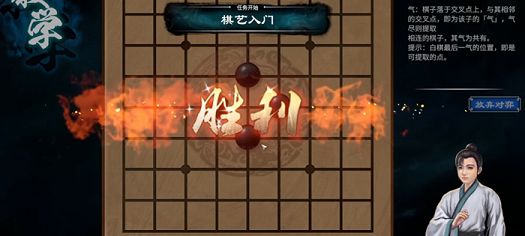这个围棋的玩法其实不难,围棋是下在棋盘上的交汇线上的,而和我们下子相邻的交叉点就叫做这个子的气,如果气尽了就会被提取。白棋最后一个气的位置就是我们可以提取的地点。长空村的这个围棋其实就是一个新手教程,可以看到白字落在最中央,东西北三方被黑子包围了,这里我们只需要将黑子下在白字的南方就可以进行提取。
