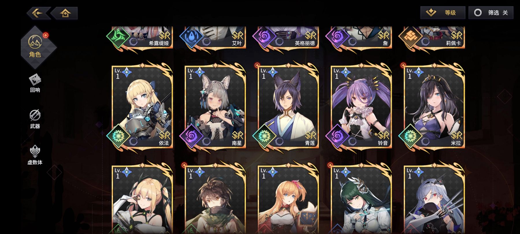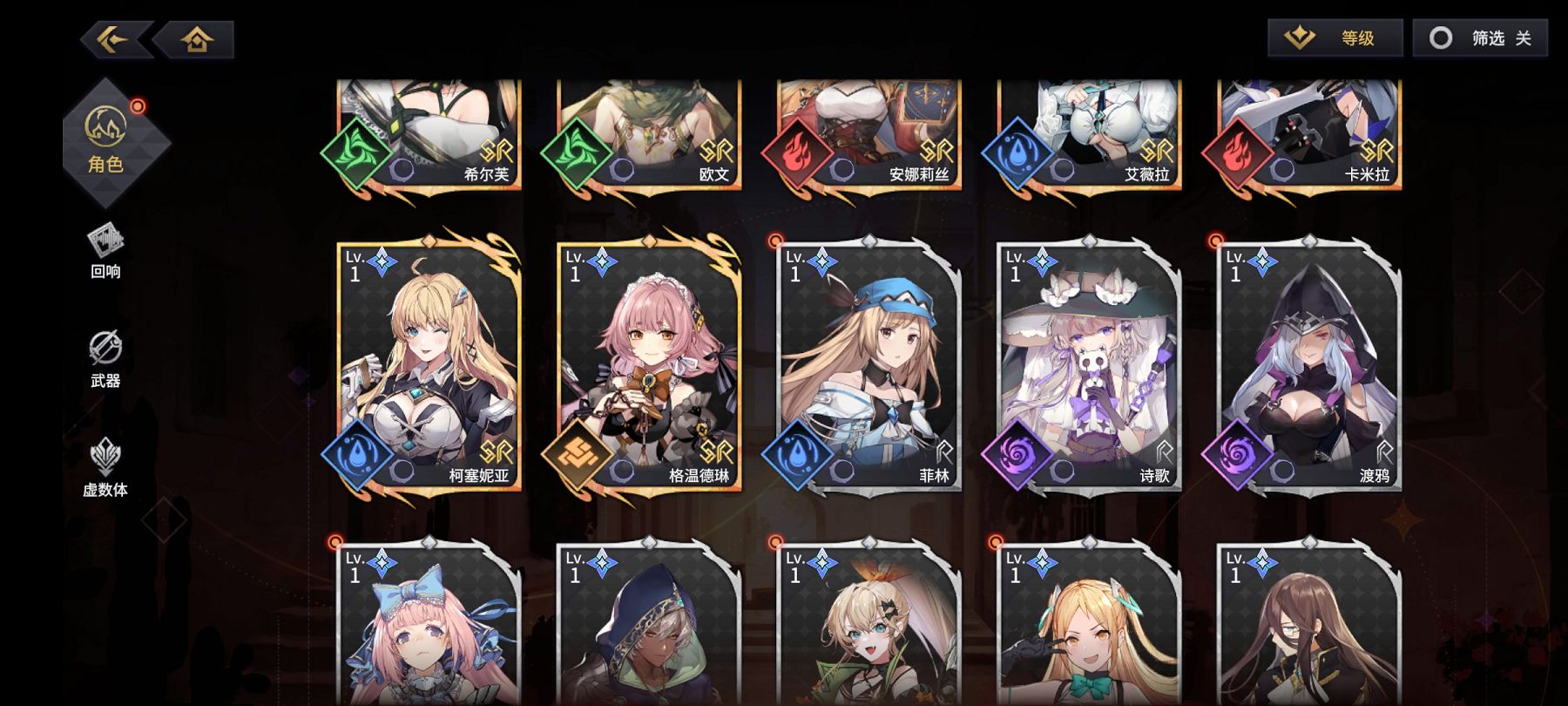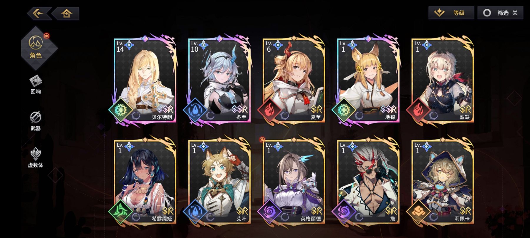 对于大多数玩家来说,SR级别的角色才是我们的游戏核心,因为获取难度和提升等级的速度以及培养消耗的资源都相对SSR容易很多,而前期一个高等级的SR起到的效果远比一个刚抽到的SSR强得多。