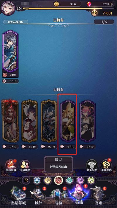 1、如何查看:首先进入到游戏中的主页面位置,点击底部导航栏的“英雄一栏”,然后继续点击英雄栏低下的“影刃”选项(小编会在图中标注出来)。在这里可以看到游戏所有的刺客系英雄,方便大家更快找到莉莉。
