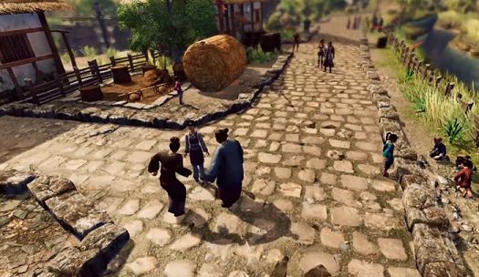 这里我们来到水车附近有一群孩童游玩的地方可以二次遭遇刘婶她们,她们在路口进行谈话。这次我们学乖了,直接跳上屋顶偷听刘婶她们的对话。原来刘婶也是村中暴富的人之一,虽然平时看起来低调但是外面有很多的田产。此时刘婶她们已经走了,我们需要找到她们接头的地方。下去之后找旁边的小女孩对话,小女孩提示找村中的空桶。