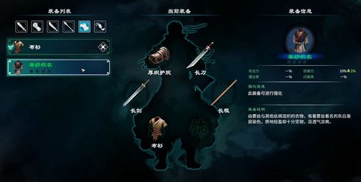 麻纱织衣能够提升我们10%的防御力,是由雾丝和其他丝绸混合织成的衣物,有着雾丝着名的灰白渐层染色,质地虽然轻盈但是也十分坚韧。而且麻纱织衣也是可以进行强化的,我们可以消耗对一个数量的铁块、百炼钢等素材在防御力、闪避率、血量以及内力这四个方向进行强化。