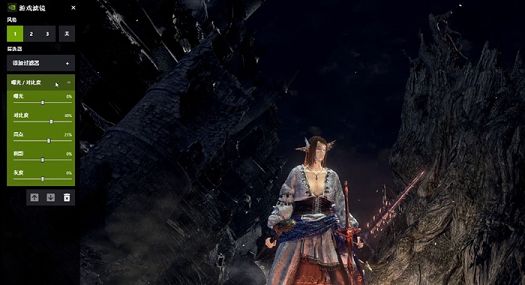 另外就是游戏外的一些设置选项了,大家打开nvidia控制面板,将艾尔登法环应用程序下的首选图形处理器设置为高性能nvidia处理器并且将下方设置值中设定为高性能,电源管理模式设置为最佳功率。这样可以在不损失画面的情况提高帧数。而我们在利用游戏中的nvida滤镜功能则可通过调节过滤器的方式提升艾尔登法环的画面表现。