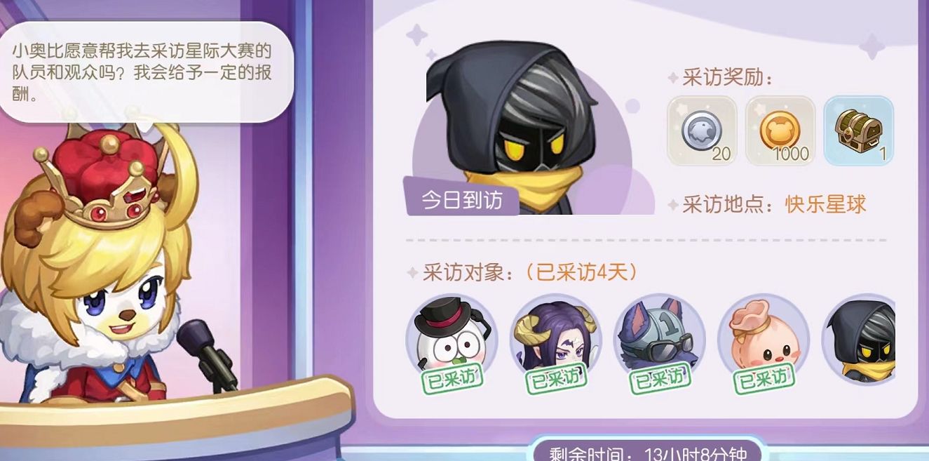不过需要注意的是,要采访的对象会在星际大赛这个场景中随机走动的,没有固定的位置,所以需要玩家自行寻找,并且玩家需要等他站在原地不动的时候,才可以开始采访,不然就需要跟随着这个角色直到他停下才行。