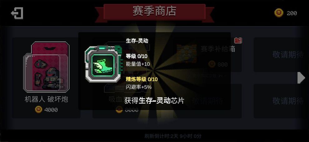 1、在游戏中可以通过每局的结算得到一定的金币,用这个金币可以开启当前赛季的补给箱,开启后可以得到【芯片】作为奖励,芯片是无限期。