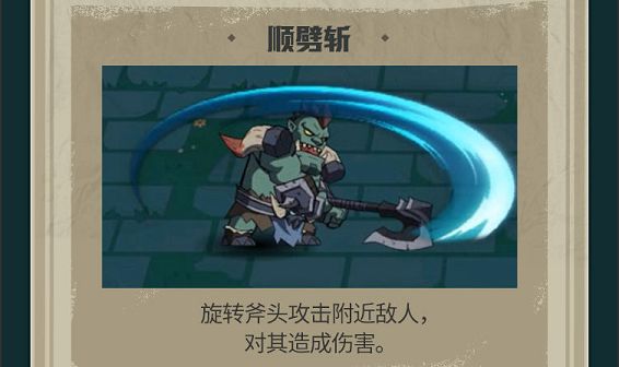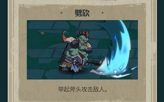 首先为各位讲解一下这个半兽人的技能介绍,它的劈砍就是举起斧头攻击敌人,顺劈斩就是旋转斧头攻击附近的敌人,并对其造成一定的伤害。