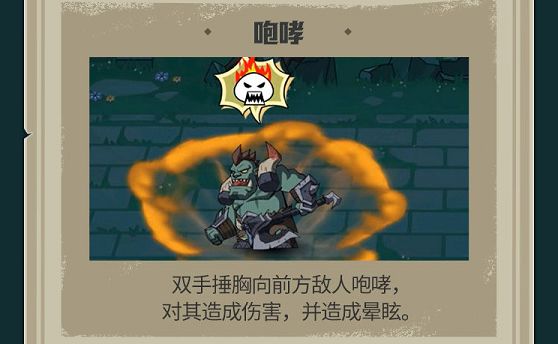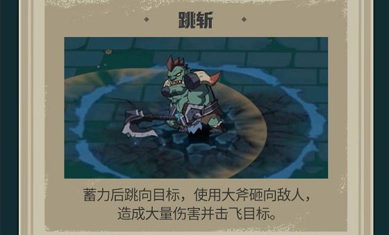 跳斩技能就是,半兽人在蓄力之后跳向目标,然后使用大斧头向对方砸去,会造成大量的伤害,并且还有击飞目标的效果。它的咆哮技能是双手捶胸向前方的敌人咆哮,会对其造成伤害,并造成眩晕的效果。