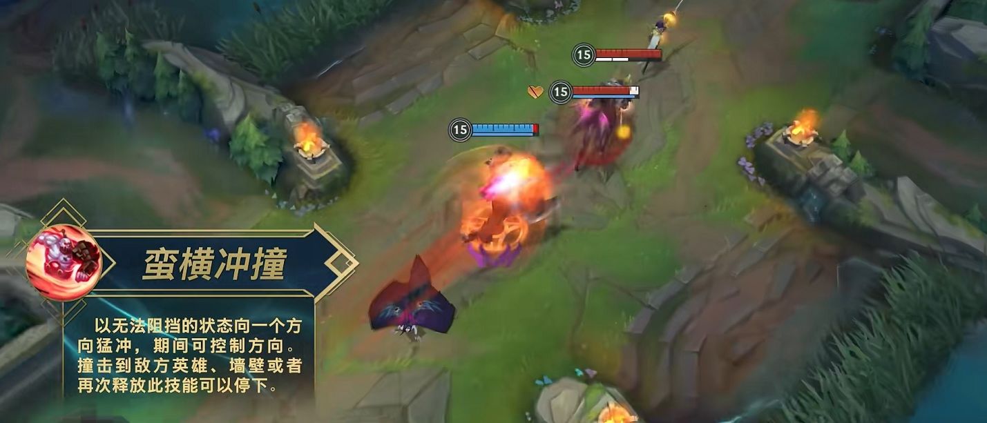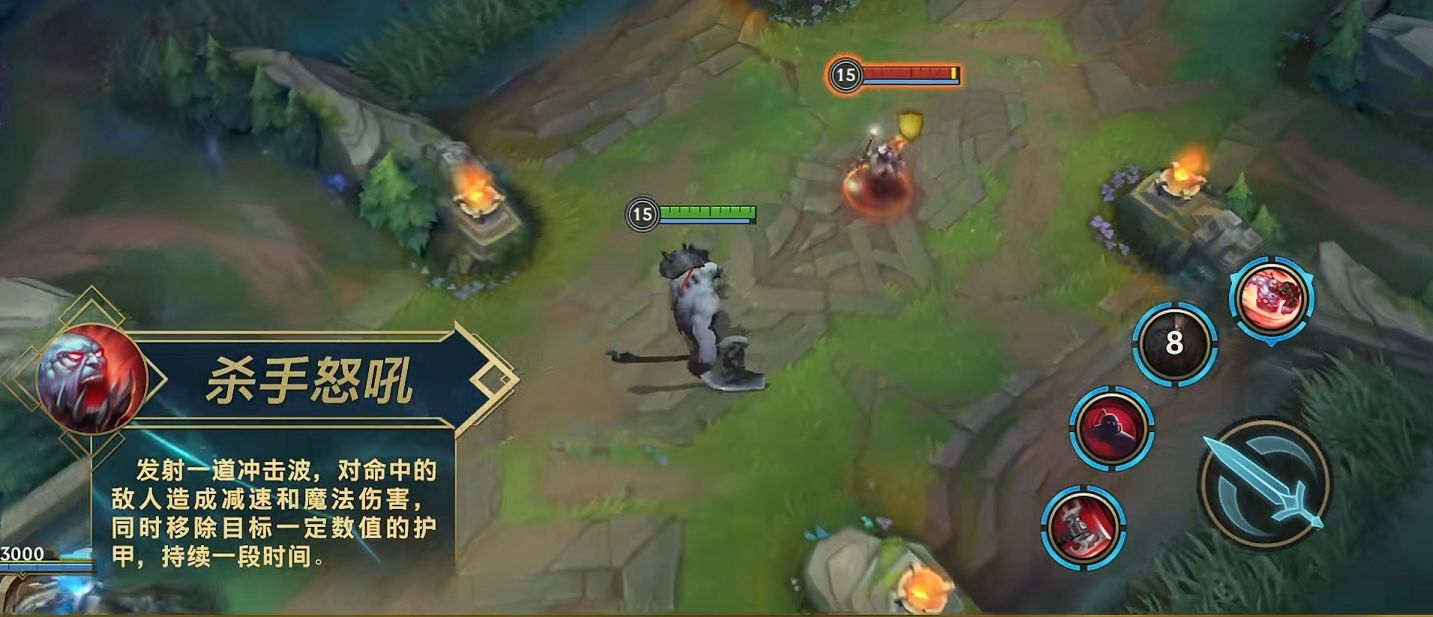 E技能杀手怒吼,释放出冲击波,命中敌人后造成魔法伤害,并且降低敌方护甲。R技能蛮横冲撞,可以朝一个方向猛冲,期间可以控制改变方向,撞到敌方英雄或墙壁后可以停止猛冲。停止后猛击地面,对敌人造成物理伤害,根据蓄力的时间获得击飞和眩晕效果。
