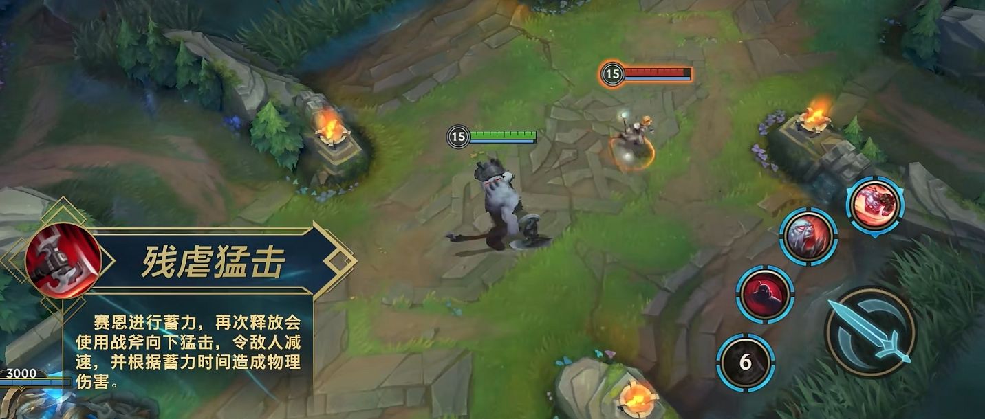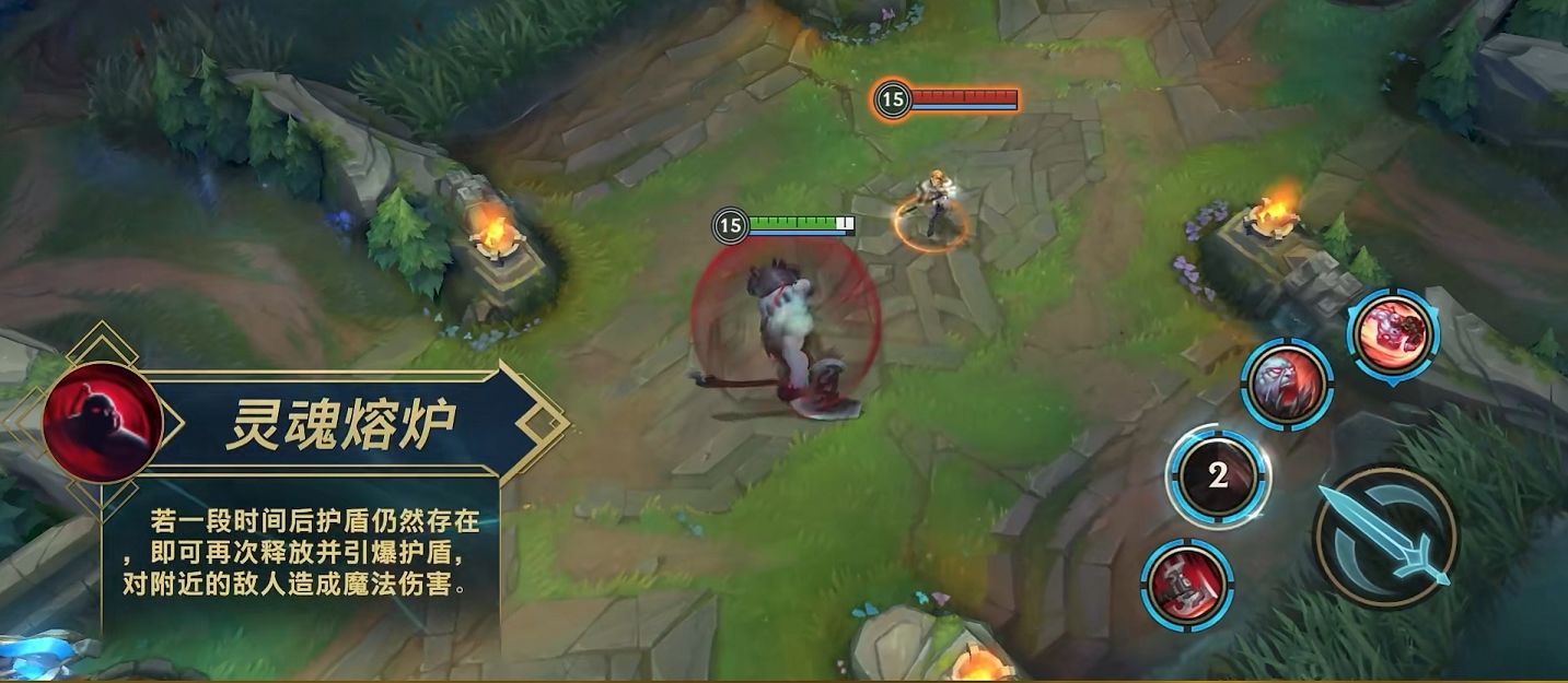 赛恩的Q技能残虐猛击,进行蓄力后再次使用可以将手中的战斧向下猛击,对范围内敌人造成减速和物理伤害,蓄力时间越长伤害就越高。当蓄力超过一定时间后,还可以将敌人击飞并且眩晕,蓄力时间越长伤害的范围也就越大。 W技能灵魂熔炉可以获得吸收伤害的护盾,如果三秒后护盾依然存在,可以引爆护盾造成伤害。